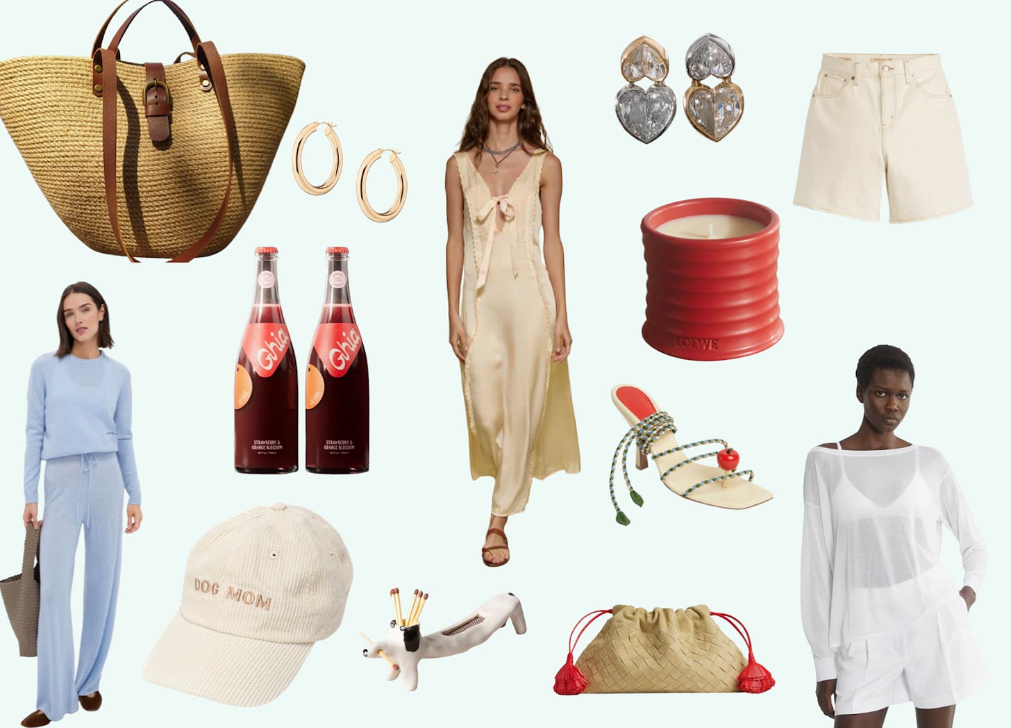 Large Raffia Bag, Gold Hoop Earring, Ghia Fizzy Drink, Knitted Sweater, Knitted Pants, Dog Mom Hat, Butter Yellow Dress, Match Holder, Diamond Earrings, Loewe Candle, Fun Sandals, Ruffle Bag, Sheer Top, Denim Shorts
